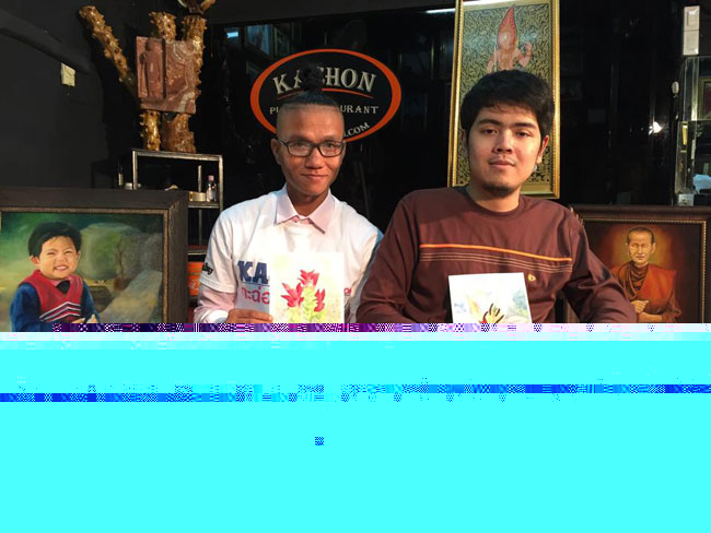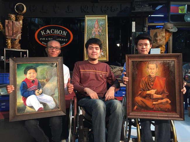 จนผมมาคิดว่าตัวเราเองก่อนที่จะประสบอุบัติเหตุนั้น เราชอบวาดรูปไม่ใช่หรือ ทำไมเราไม่ลองนำสิ่งที่เราชอบ เรารักมาลองทำเป็นอาชีพดูหละ ผมจึงเริ่มคิดหาวิธีที่จะทำให้ผมกลับมาวาดรูปได้อีกครั้ง ในช่วงแรกๆลำบากมากเลยครับ ผมพิการเป็นอัมพาตทั้งตัวไม่สามารถขยับส่วนต่างๆของร่างกายได้เลย จะขยับได้ก็เพียงแขนขวาซึ่งก็ขยับได้เพียงเล็กน้อยเท่านั้น แขนขวาที่ยกได้นิ้วมือผมก็ไม่สามารถกำหรือจับต้องสิ่งของอะไรได้เลย แล้วผมจะจับพู่กันวาดภาพได้อย่างไร ผมรู้สึกท้อแท้เป็นอย่างมากในช่วงเวลานั้น แต่ผมก็ไม่ยอมพ่ายแพ้กับความพิการของผมครับ ผมจึงคิดว่าถ้านิ้วมือเรากำมันไม่ได้ทำไมเราไม่หาอะไรมาทดแทนมันหละ ผมเลยวานให้คนดูแลผมไปหาขวดนมมาเจาะรูเพื่อเสียบพู่กันไว้ในขนาดต่างๆ แล้วให้เค้าไปหายากยืดมารัดที่ข้อมือผมให้จับอยู่กับขวดนมที่เสียบพู่กันไว้แล้วผมก็ลองเริ่มวาดภาพดู ในช่วงแรกๆก็ไม่เป็นภาพสักเท่าไหร่แต่ผมก็พยามฝึกฝนโดยไม่ท้อแท้ จนทุกวันนี้ผมก็สามารถวาดภาพออกมาได้ตามที่พวกพี่ๆเห็นอยู่นี่แหละครับ