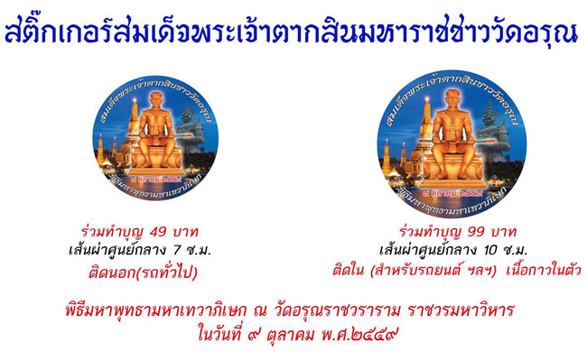 ในงานพิธีมหาพุทธาและมหาเทวาภิเษกพระรูปสมเด็จพระเจ้าตากสินมหาราชชาววัดอรุณขนาดบูชา 9 นิ้ว ในครั้งนี้ ทางคณะผู้จัดงานยังได้จัดทำสติ๊กเกอร์ สมเด็จพระเจ้าตากสินมหาราชชาววัดอรุณ ขนาดความกว้าง 7 ซม สำหรับติดด้านนอกรถทั่วไป(มอเตอร์ไซค์) และขนาดความกว้าง 10 ซม สำหรับติดด้านในรถยนต์ เป็นสติ๊กเกอร์ PVC อย่างดี ในราคาร่วมทำบุญ 49 บาทและ 99 บาท ไว้สำหรับท่านที่ขับขี่ยวดยานพาหนะจะได้นำไปติดรถของท่านเพื่อความเป็นศิริมงคล