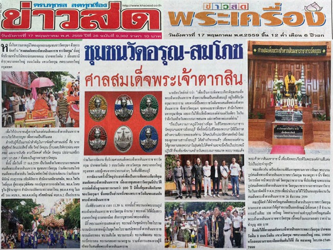 ด้วยพระบารมีของเหรียญสมเด็จพระเจ้าตากสินมหาราชชาววัดอรุณที่เขาห้อยอยู่ เป็นข่าวเกรียวกราวตามหน้าหนังสือพิมพ์หลายๆฉบับ เช่น ข่าวสด คมชัดลึก บ้านเมือง สยามรัฐ กำลังเป็นที่ต้องการเสาะหาบูชา ของผู้ที่เคารพรักและศรัทธาใน องค์พระบาทสมเด็จพระเจ้าตากสินมหาราชอยู่ในขณะนี้