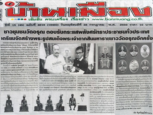 ข่าวการสร้างพระรูปสมเด็จพระเจ้าตากสินมหาราชชาววัดอรุณ ขนาดบูชา 9 นิ้ว ในหนังสือพิมพ์บ้านเมือง ฉบับวันนี้