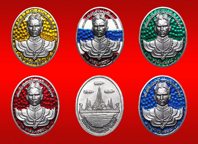 1.เหรียญสมเด็จพระเจ้าตากสินมหาราชชาววัดอรุณ เนื้อตะกั่วลงยาลายธงชาติ สร้างขึ้นโดยการนำเหรียญสมเด็จพระเจ้าตากสินมหาราชชาววัดอรุณ เนื้อตะกั่ว มาทำการแกะลายแล้วลงยาเป็นลายธงชาติ จำนวนการสร้าง 216 เหรียญ แบ่งบรรจุในใต้ฐานพระรูปละ 1 เหรียญ และยังสร้างเหรียญสมเด็จพระเจ้าตากสินมหาราชชาววัดอรุณ เนื้อตะกั่วแกะลายลงยา อีก 4 สี จำนวนการสร้างสีละ 108 เหรียญ เพื่อให้เป็นเอกลักษณ์พิเศษของงานมหาพุทธามหาเทวาภิเษกพระรูปสมเด็จพระเจ้าตากสินมหาราชชาววัดอรุณขนาดบูชา เพื่อให้พี่น้องประชาชนผู้ศรัทธาในองค์พระบาทสมเด็จพระเจ้าตากสินมหาราช ได้ร่วมทำบุญในราคาเหรียญละ 400 บาท เพื่อเก็บรักษาบูชาไว้เป็นที่ระลึกและท่านยังได้ร่วมทำบุญอีกต่อหนึ่งด้วย เพราะเงินรายได้ทั้งหมดในการจำหน่ายเหรียญในครั้งนี้ จะนำไปเป็นกองทุนในการจัดงานวันพระบาทสมเด็จพระเจ้าตากสินมหาราช 28 ธันวาคม 2559 ซึ่งลูกหลานชาววัดอรุณจะจัดพิธีบวงสรวงและการแสดงต่างๆมากมายอาทิเช่น มังกร สิงโต กระตั้ว กลองยาว พินแคน กระบี่กระบอง เพื่อเทิดพระเกียรติถวายในพระองค์ท่านเป็นประจำทุกๆปีอย่างยิ่งใหญ่สมพระเกียรติในพระองค์ท่าน ณ ศาลสมเด็จพระเจ้าตากสินมหาราชชาววัดอรุณ ปากซอยวังเดิม 3 แขวงวัดอรุณ เขตบางกอกใหญ่ กรุงเทพฯ ซึ่งเหรียญสมเด็จพระเจ้าตากสินมหาราชชาววัดอรุณนั้น เป็นเหรียญที่จัดสร้างขึ้นด้วยเจตนาที่บริสุทธิ์ ปลุกเสกอย่างถูกต้องตามประเพณีโบราณทุกประการ โดยพระคณาจารย์ผู้เรืองวิทยาคมแห่งยุคปัจจุบันอาทิเช่น หลวงพ่อพระมหาสุรศักดิ์ เจ้าอาวาสวัดประดู่พระอารามหลวง จ.สมุทรสงคราม หลวงพ่อตี๋ เจ้าอาวาสวัดหูช้าง จ.นนทบุรี พระอาจารย์ป้อม เจ้าอาวาสวัดหนองม่วง จังหวัดราชบุรี พระอาจารย์อภิญญา(หลวงพ่อญา) วัดบางพระ จ.นครปฐม พระอาจารย์หนุ่ม วัดบางแวก จ.กรุงเทพฯ เป็นเหรียญที่มากด้วยประสบการณ์เช่น รายล่าสุดหนุ่มคาร์แคร์โดนไฟดูดกว่าสองนาที แต่กลับรอดตายได้ราวปาฏิหารย์ ด้วยพระบารมีของเหรียญสมเด็จพระเจ้าตากสินมหาราชชาววัดอรุณที่เขาห้อยอยู่ เป็นข่าวเกรียวกราวตามหน้า หนังสือพิมพ์หลายๆฉบับ เช่น ข่าวสด คมชัดลึก บ้านเมือง สยามรัฐ กำลังเป็นที่ต้องการเสาะหาบูชา ของผู้ที่เคารพรักและศรัทธาในองค์พระบาทสมเด็จพระเจ้าตากสินมหาราชอยู่ในขณะนี้ ท่านสามารถติดต่อร่วมทำบุญได้ที่หน้าบริเวณจัดงานพิธีมหาพุทธามหาเทวาภิเษกพระรูปสมเด็จพระเจ้าตากสินมหาราชชาววัดอรุณ ขนาดบูชา 9 นิ้ว ในวันอาทิตย์ที่ 9 ตุลาคม 2559 ณ พระวิหารน้อยหน้าพระปรางค์วัดอรุณ หรือก่อนวันจัดงานได้ที่ ศาลส