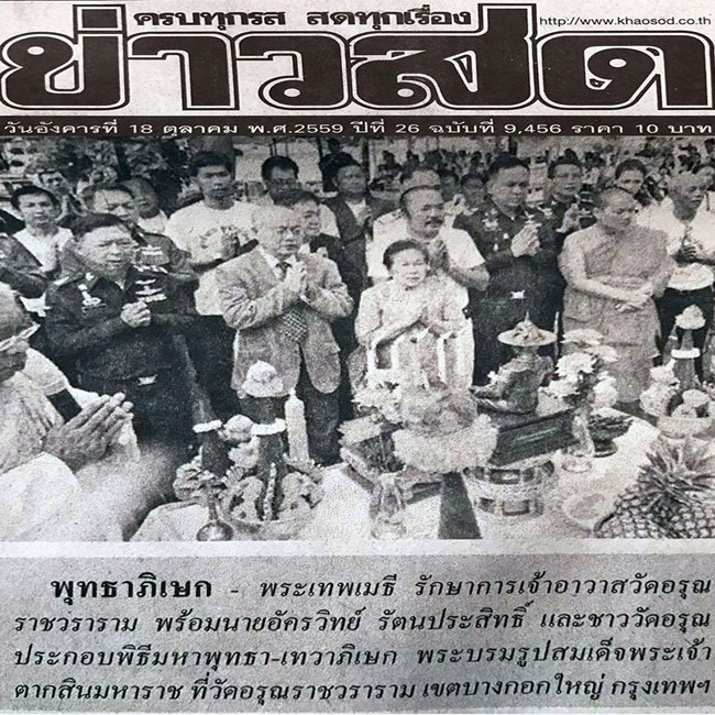 ข่าวพิธีปลุกเสกครั้งประวัติศาสตร์ของลูกหลานชาววัดอรุณฝั่งธนบุรี พิธีมหาพุทธามหาเทวาภิเษก พระรูปสมเด็จพระเจ้าตากสินมหาราชชาววัดอรุณ ขนาดบูชา 9 นิ้ว ณ วัดอรุณราชวราราม ในหนังสือพิมพ์ ข่าวสดรายวัน ฉบับประจำวันที่ 18 ตุลาคม 2559