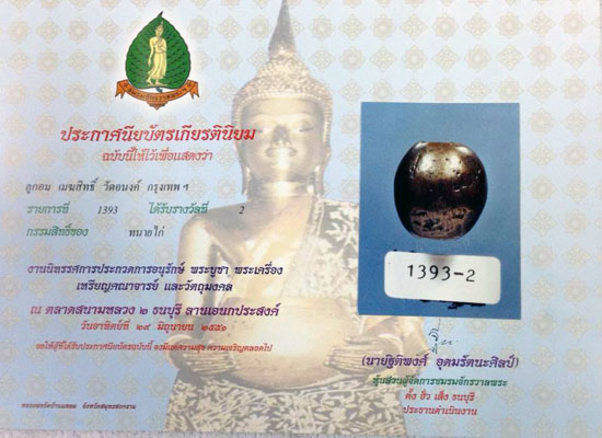 ใบประกาศชนะการประกวดที่ 2 ลูกอมเมฆสิทธิ์ หลวงปู่ทับ วัดอนงค์