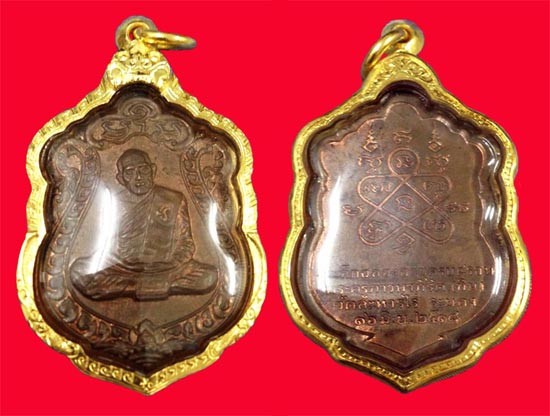 2.เหรียญฉลุเสมาลงยาเนื้อเงินหลังเงินหน้าทอง สร้างจำนวน 169 เหรียญ กลับเป็นอายุหลวงปู่ได้ 96 ทำบุญเหรียญละ 1000 บาท