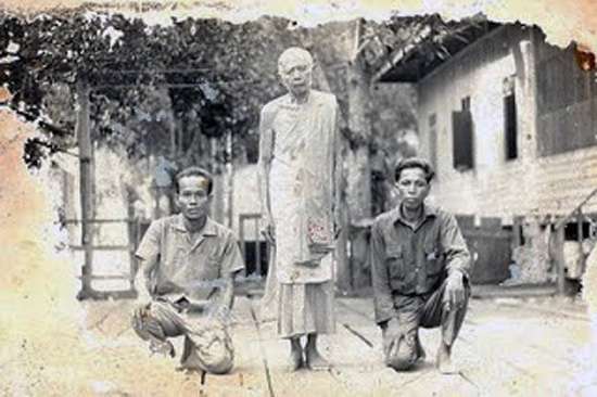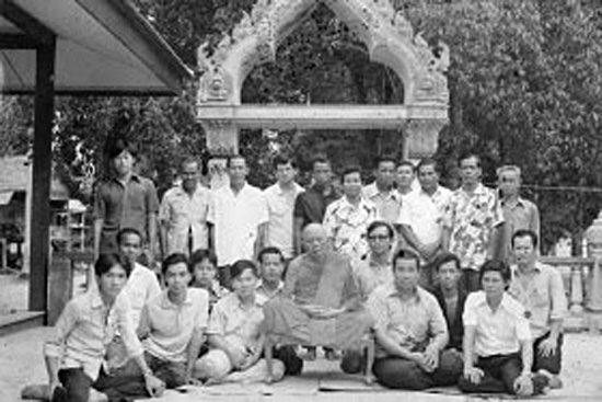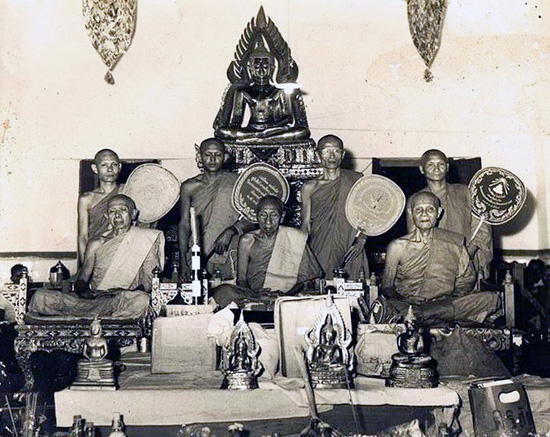 พระเถราจารย์ชื่อดังในอดีตแห่งเมืองระยอง แถวนั่งซ้ายมือสุด : หลวงปู่ทิม อิสริโก วัดละหารไร่
