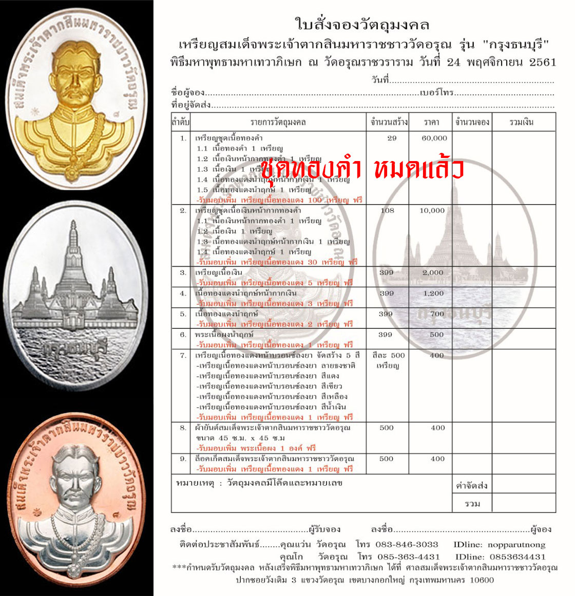 โดยท่านผู้ศรัทธาในพระองค์ท่าน สามารถติดต่อร่วมทำบุญใหญ่เป็นเจ้าของ เหรียญสมเด็จพระเจ้าตากสินมหาราชชาววัดอรุณ รุ่นกรุงธนบุรี เนื้อพิเศษตามรายการสั่งจอง เพื่อร่วมเป็นเจ้าภาพในการจัดสร้างเหรียญสมเด็จพระเจ้าตากสินมหาราชชาววัดอรุณ รุ่นกรุงธนบุรี เพื่อแจกฟรีในครั้งนี้ได้ที่ ศาลสมเด็จพระเจ้าตากสินมหาราชชาววัดอรุณ ปากซอยวังเดิม 3 ถนนวังเดิม แขวงวัดอรุณ เขตบางกอกใหญ่ กทม 10600 หรือสอบถามรายละเอียดเพิ่มเติมได้ที่ 1.คุณแว่น วัดอรุณ เบอร์โทร 083-846-3033 id line: nopparutnong 2.คุณโก วัดอรุณ เบอร์โทร 085-363-4431 id line: 0853634431